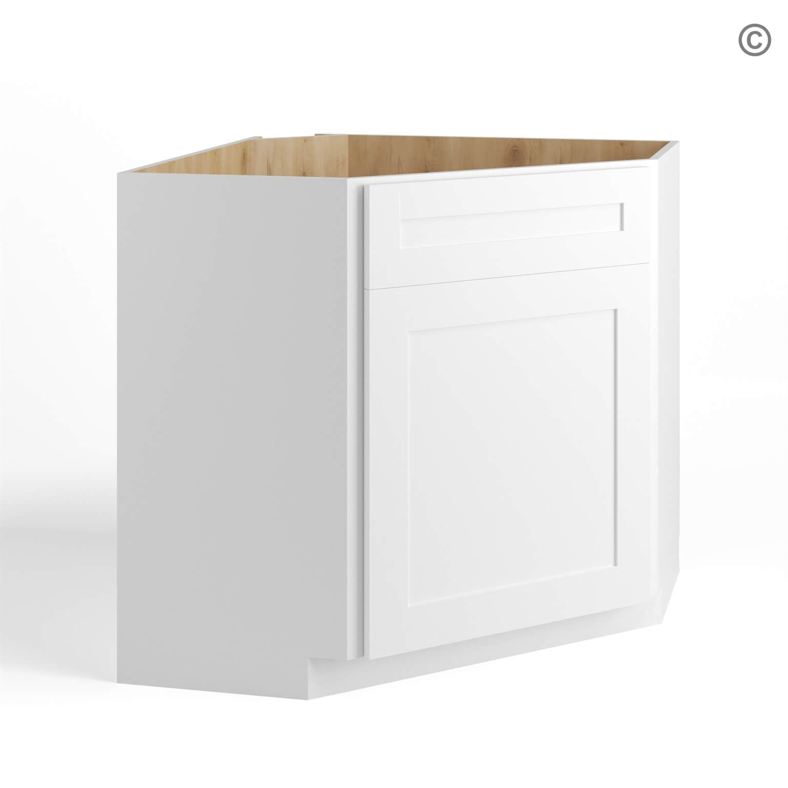 White Shaker Corner Sink Base Cabinet is 34.5″ tall, 36″ long, and available 36″ wide. This shaker white cabinet will fit perfectly in your kitchen or bathroom. The brilliant shade of shaker white cabinet will make your rooms exude modernity and quality.